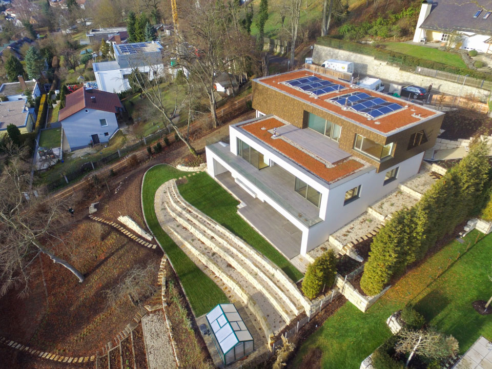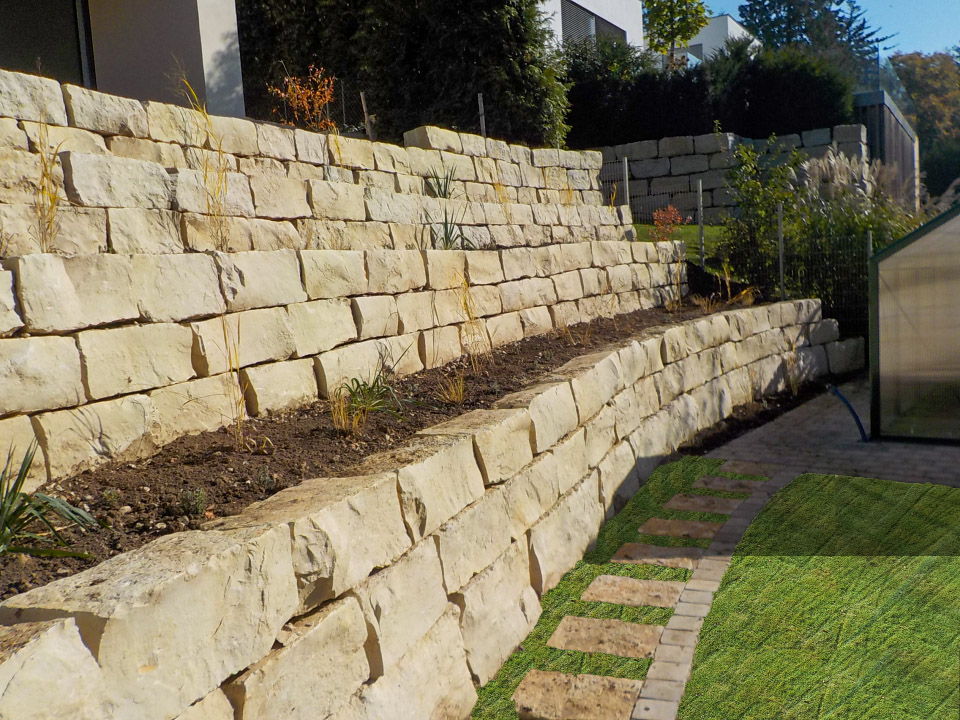 Die besondere Herausforderung dieses Gartens liegt in seiner ausgeprägten Hanglage. Durch gezielte Terrassierungen mit Natursteinmauern wurde der Höhenversprung strukturell gefasst und gestalterisch aufgewertet.